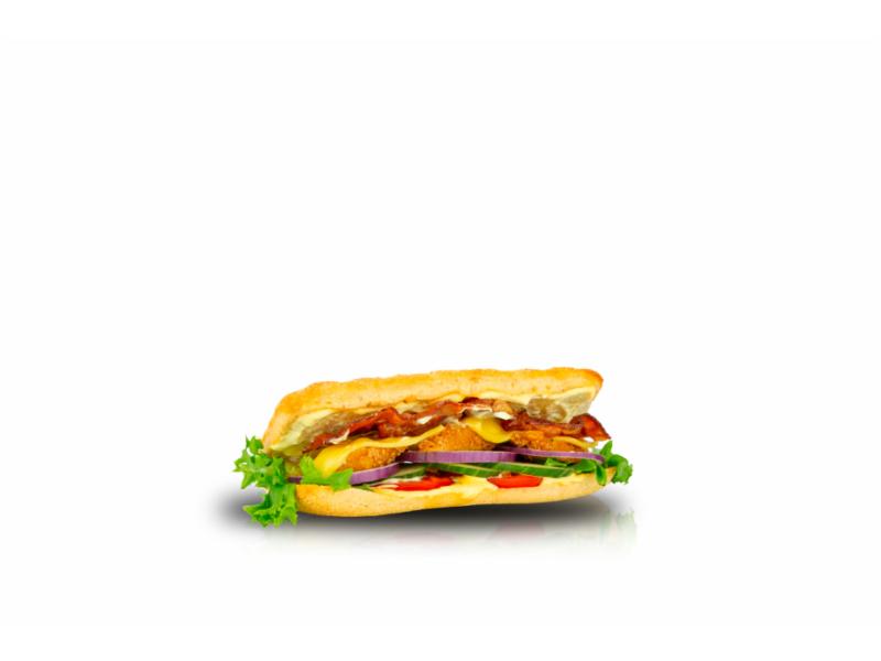 Saftig og sprø CFC Tender i mykt durum sandwichbrød. Med bacon, ost, aioli, salat, tomat, agurk og rødløk.Allergener: GLUTEN (hvete), SOYA, MELK, EGG, SELLERI, SULFITT