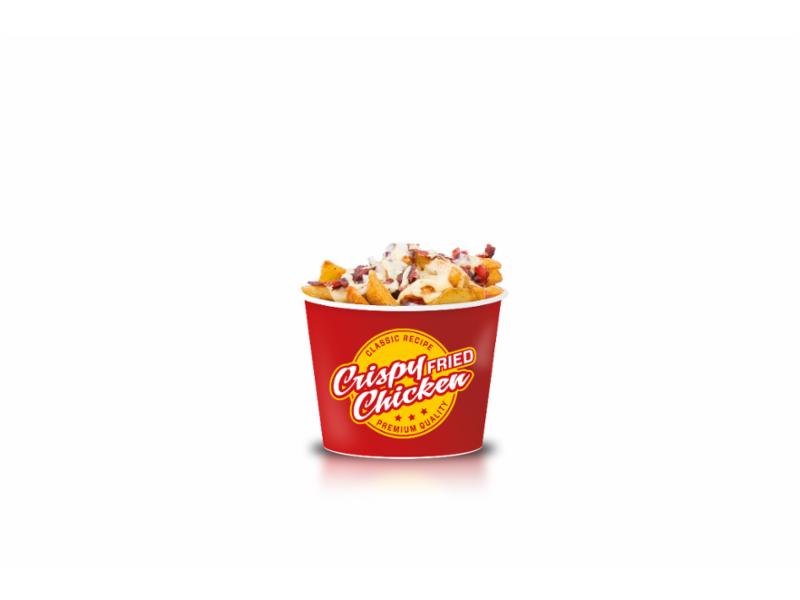 Sprø CFC Fries toppet med rødløk, crispy bacon og garlic parmesan dressing. Allergener: EGG, MELK, SENNEP