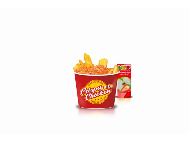 Vår meny for de minste består av 4 biter CFC Nuggets av ren norsk kyllingfilet, CFC Fries og MER Jordbær og Eple.Allergener: GLUTEN (hvete), SOYA, MELK, EGG, SELLERI