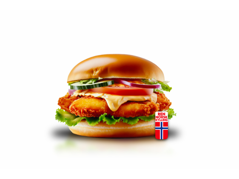 Saftig og sprø 220gr CFC Filet Burger. Hel norsk kyllingfilet i mykt Brioche burgerbrød.Med dressing, salat, tomat, agurk og rødløk.Allergener: GLUTEN (hvete), SOYA, MELK, EGG, SELLERI, SULFITT